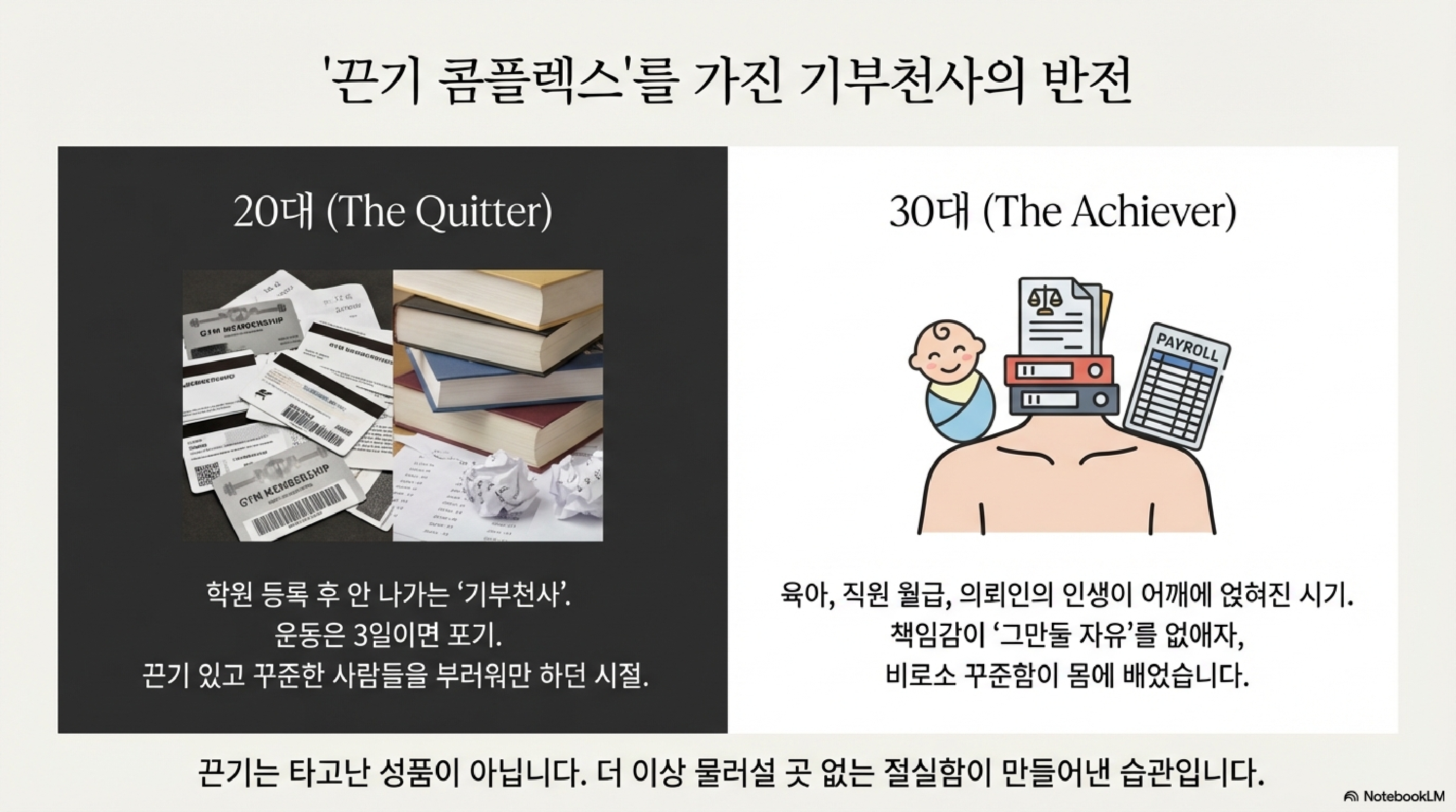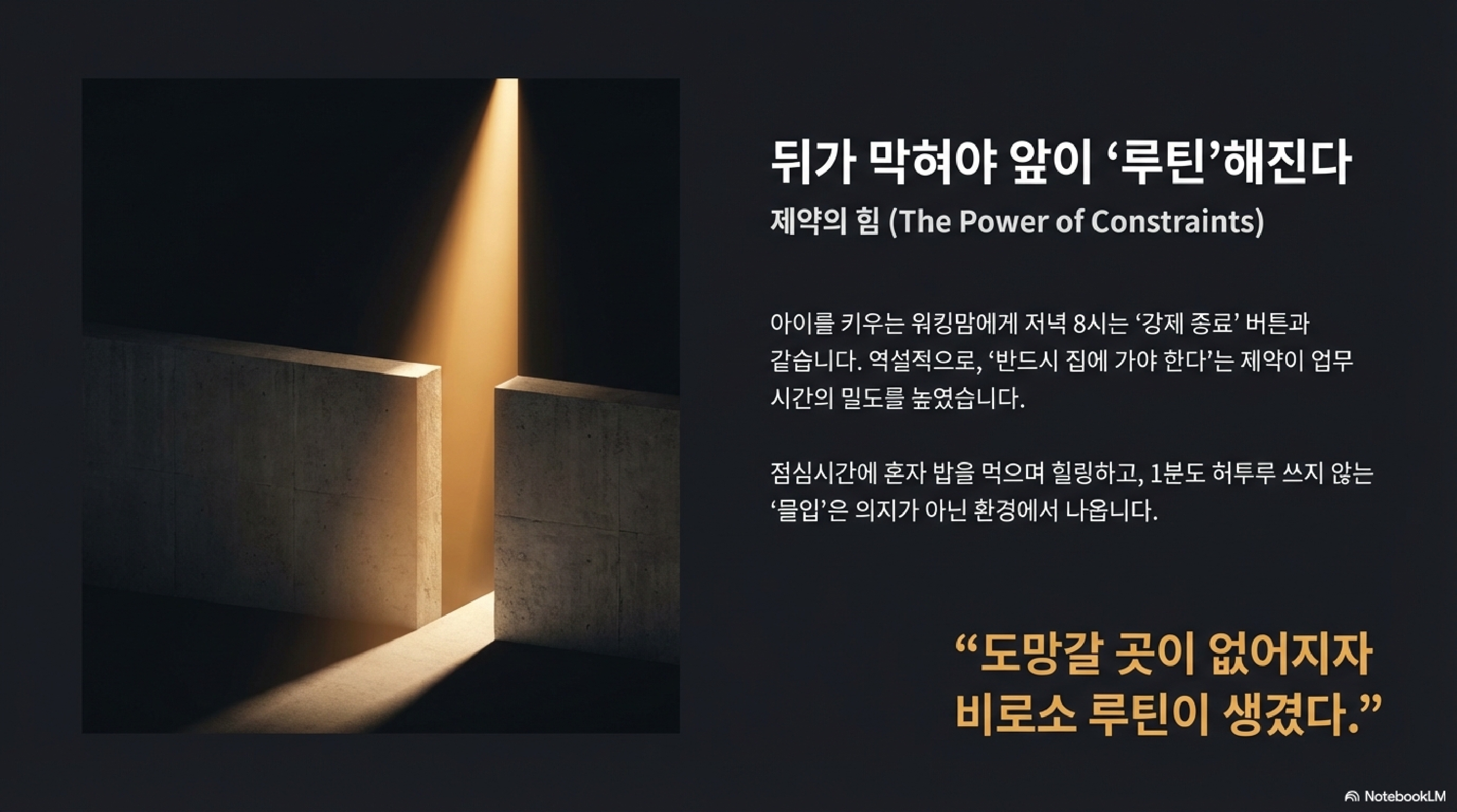 아이를 위해 저녁 8~9시에는 반드시 귀가해야만 하는 환경이 조성되자, 역설적으로 업무 시간의 몰입도가 극대화되었습니다. 이를 뒤가 막혀야 앞이 루틴해진다 법칙으로 설명할 수 있습니다. 도망갈 곳 없는 책임감과 탈출구 없는 시간 제한이 극강의 끈기를 만들어낸 것입니다. 환경 설정을 통해 배수진을 치는 것, 이것이 의지력보다 강력한 몰입의 비결입니다.