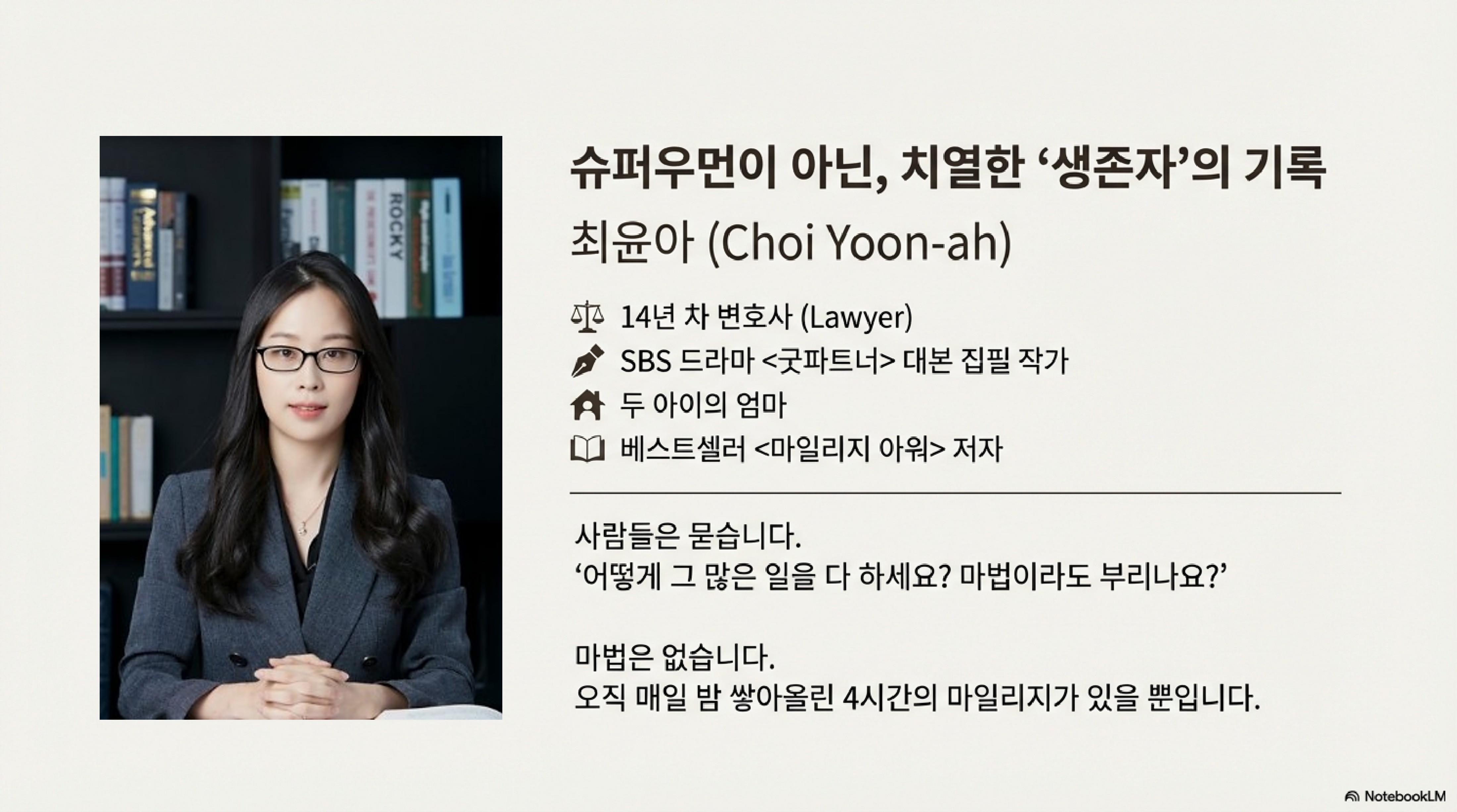 매일 본업의 무게에 치여 "나름대로 열심히 살고 있는데, 왜 제자리걸음인 것 같지?"라는 무력감을 느껴본 적이 있나요? 퇴근 후 침대에 누워 스마트폰을 뒤척이다 잠드는 일상이 반복되면, 성장은 먼 나라 이야기처럼 들리기 마련입니다. 하지만 우리와 똑같은 24시간을 살면서도 14년 차 베테랑 변호사, 화제의 드라마 '구트너'의 작가, 그리고 두 아이를 키우는 워킹맘이라는 세 가지 역할을 완벽하게 수행해 낸 인물이 있습니다. 바로 최윤아 작가입니다.