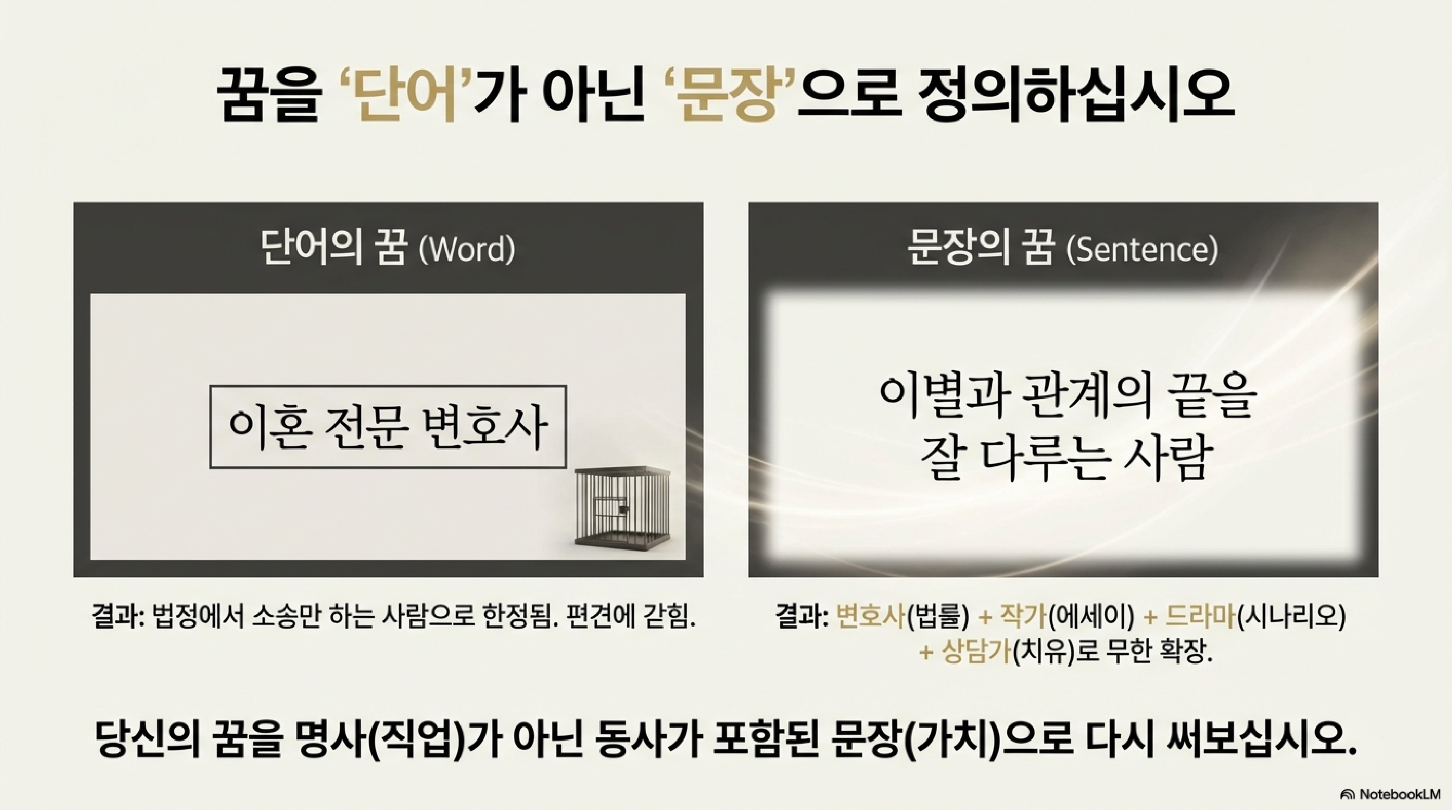 - 문장형 목표 (확장성): '이별을 다루는 사람' → 변호사, 드라마 작가, 에세이스트로 정체성 확장.