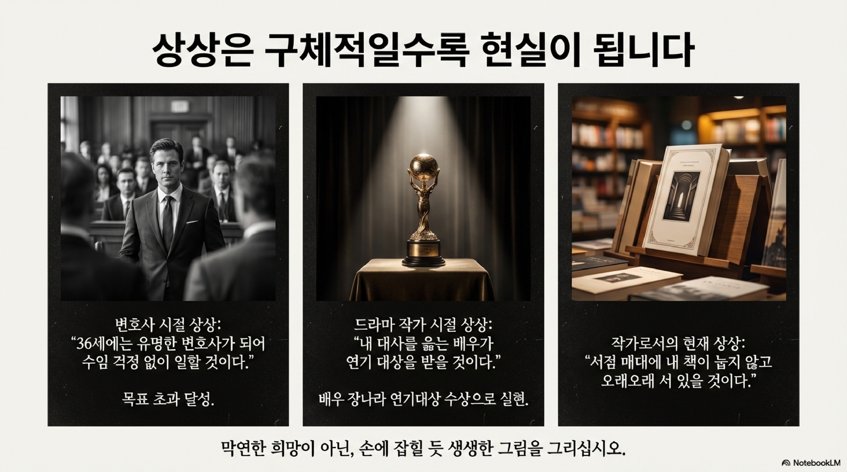 - 성공의 시각화: 드라마 작가로서 내 대본을 연기한 배우가 대상을 받는 장면을 상상했고, 실제로 그 배우는 연기 대상을 거머쥐었습니다.